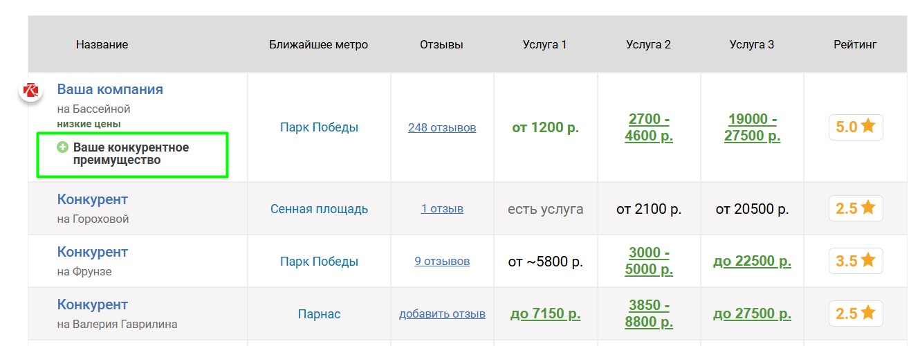 агентств, продвигаемое агентство попадёт к ним в таблицу «Сравнение по ценам», которая выглядит следующим образом: